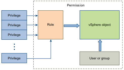 Users, and roles control who has access to vSphere components and what actions each user can perform. A role is a predefined set of privileges. Privileges define rights to perform actions and read properties. For example, the Virtual Machine Administrator role consists of read properties and of a set of rights to perform actions. The role allows a user to read and change virtual machine attributes. When you assign permissions, you pair a user or group with a role and associate that pairing with an inventory object. A single user or group can have different roles for different objects in the inventory.