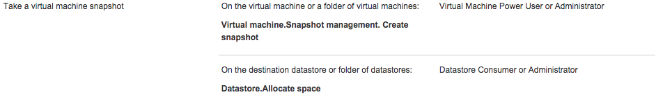 - Any operation that consumes storage space, such as creating a virtual disk or taking a snapshot, requires the Datastore.Allocate Space privilege on the target datastore, as well as the privilege to perform the operation itself.