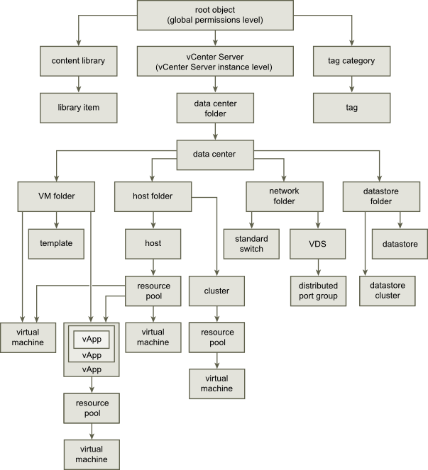 Most inventory objects inherit permissions from a single parent object in the hierarchy. For example, a datastore inherits permissions from either its parent datastore folder or parent data center. Virtual machines inherit permissions from both the parent virtual machine folder and the parent host, cluster, or resource pool simultaneously.