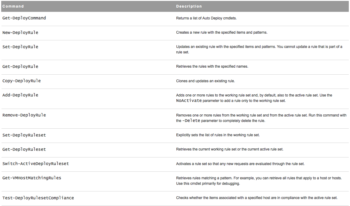 Auto Deploy cmdlets are implemented as Microsoft PowerShell cmdlets and included in vSphere PowerCLI. Users of Auto Deploy cmdlets can take advantage of all vSphere PowerCLI features.